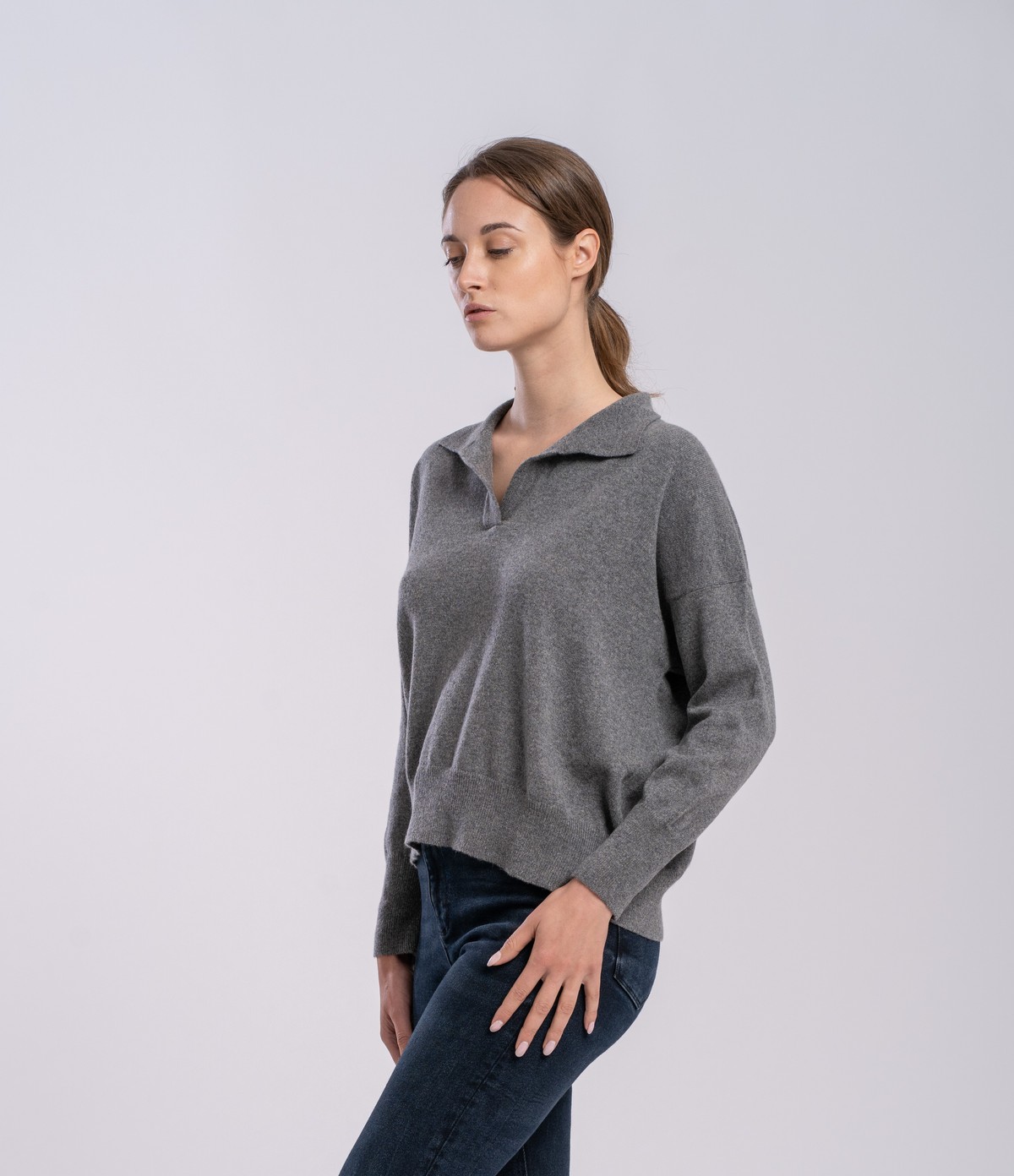 One ply buttonless polo neck sweater.